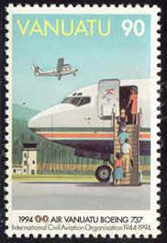 Boeing 737-400 of Air Vanuatu Ltd. (1994) on the tarmac at Bauerfield International Airport, Port Vila. Also shown is the de Havilland Canada DHC-6 Twin Otter of the domestic operator, Vanair. Air Vanuatu (Operation) Ltd. was established in 1989; this airline, an offspring of New Hebrides Airways, used a Bandeirante aircraft between Port Vila and Noumea, and a Boeing 737-400 to New Zealand and the east coast of Australia. The Boeing 737 is shown on the tarmac at Bauerfield International Airport, Port Vila. Also shown is the de Havilland Canada DHC-6 Twin Otter of the domestic operator, Vanair; this aircraft was the principal aircraft used between the 30 airfields scattered throughout the many islands of Vanuatu.