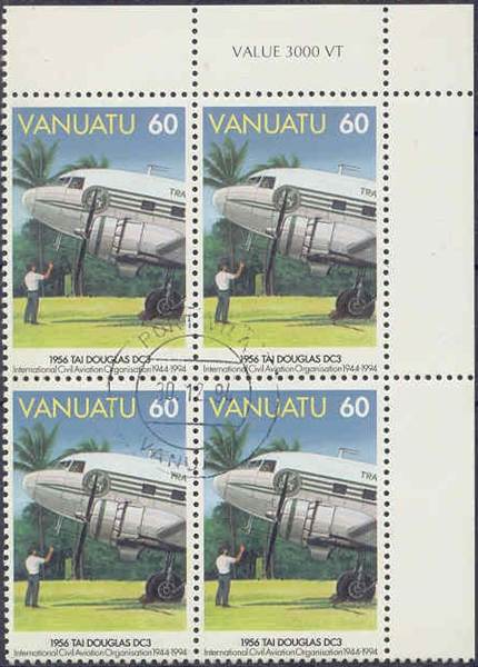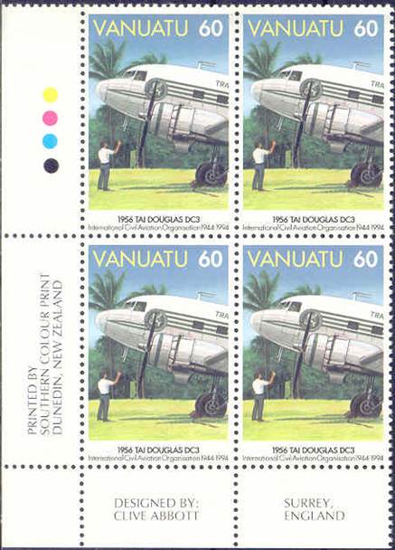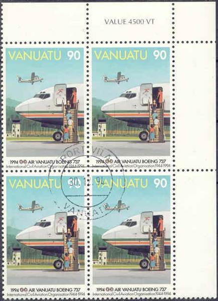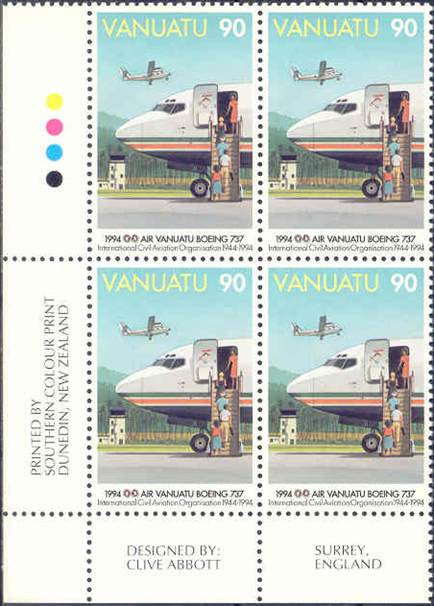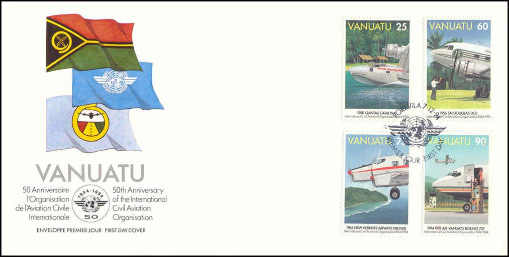 First Day Cover (front and back) showing flags of Vanuatu and ICAO. In 1993, a Civil Air Ensign design competition aimed at school children was floated. The requirements were that the Ensign should reflect an aviation background, the national colours and a definitive Vanuatu character. The competition attracted 102 entries, some quite outstanding, and the Civil Air Ensign was developed from the winning entry from Mr. James Alvine of Malapoa College (the premier secondary academic institution in Vanuatu). The design is proudly featured on the First Day Cover of this aviation issue. The yellow tusk surrounding the black silhouette of an aircraft flying out of a runway of national colours is a refreshingly simple representation of the design requirements. Two errors can be noticed on this cover: 1. The French name of the Organization should be written: Organisation de l’aviation civile internationale. 2. The word Organization in the English version must be spelled with 's', instead of 'z'.