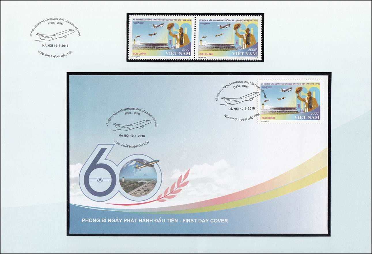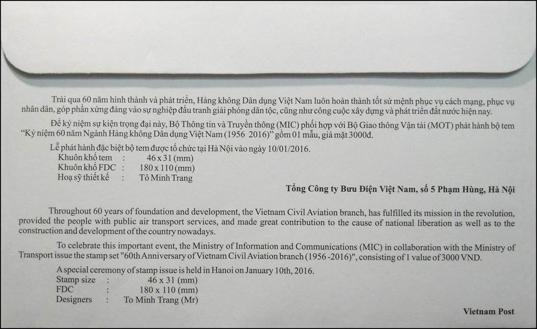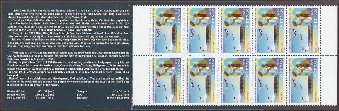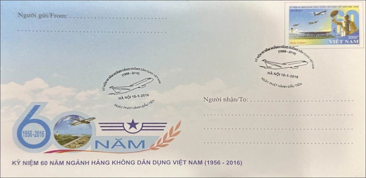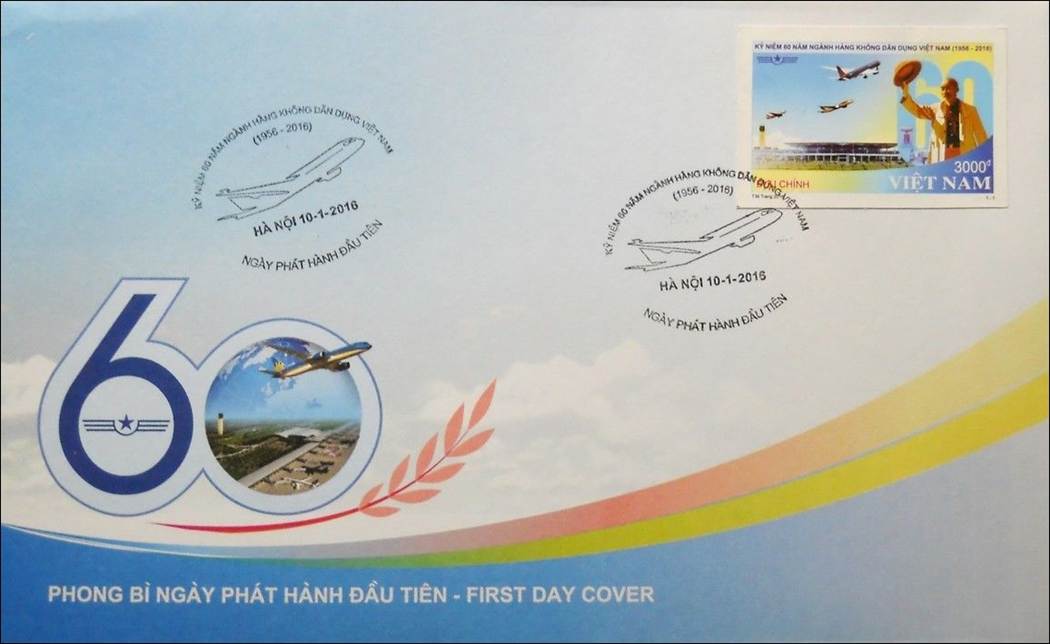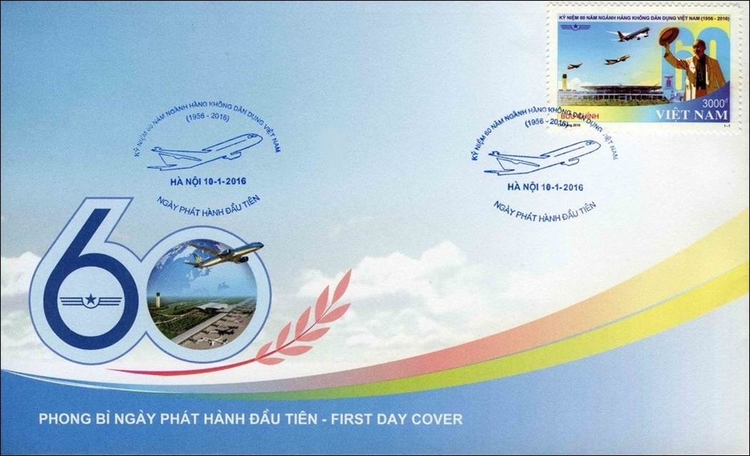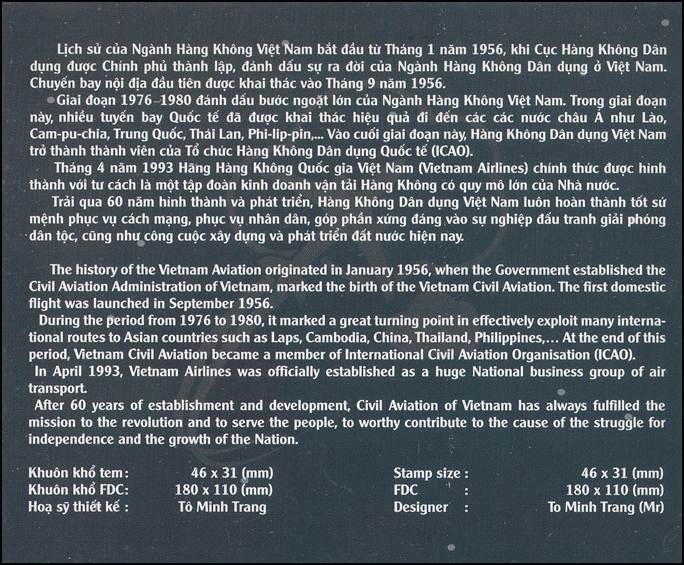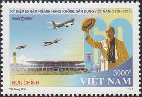 Background: The stamp was a collaborative project of the Ministry of Information and Communication and the Ministry of Transport. The stamp, designed by painter To Minh Trang, depicts the history of the civil aviation industry from 1956 to 2016, with its glorious achievements.