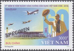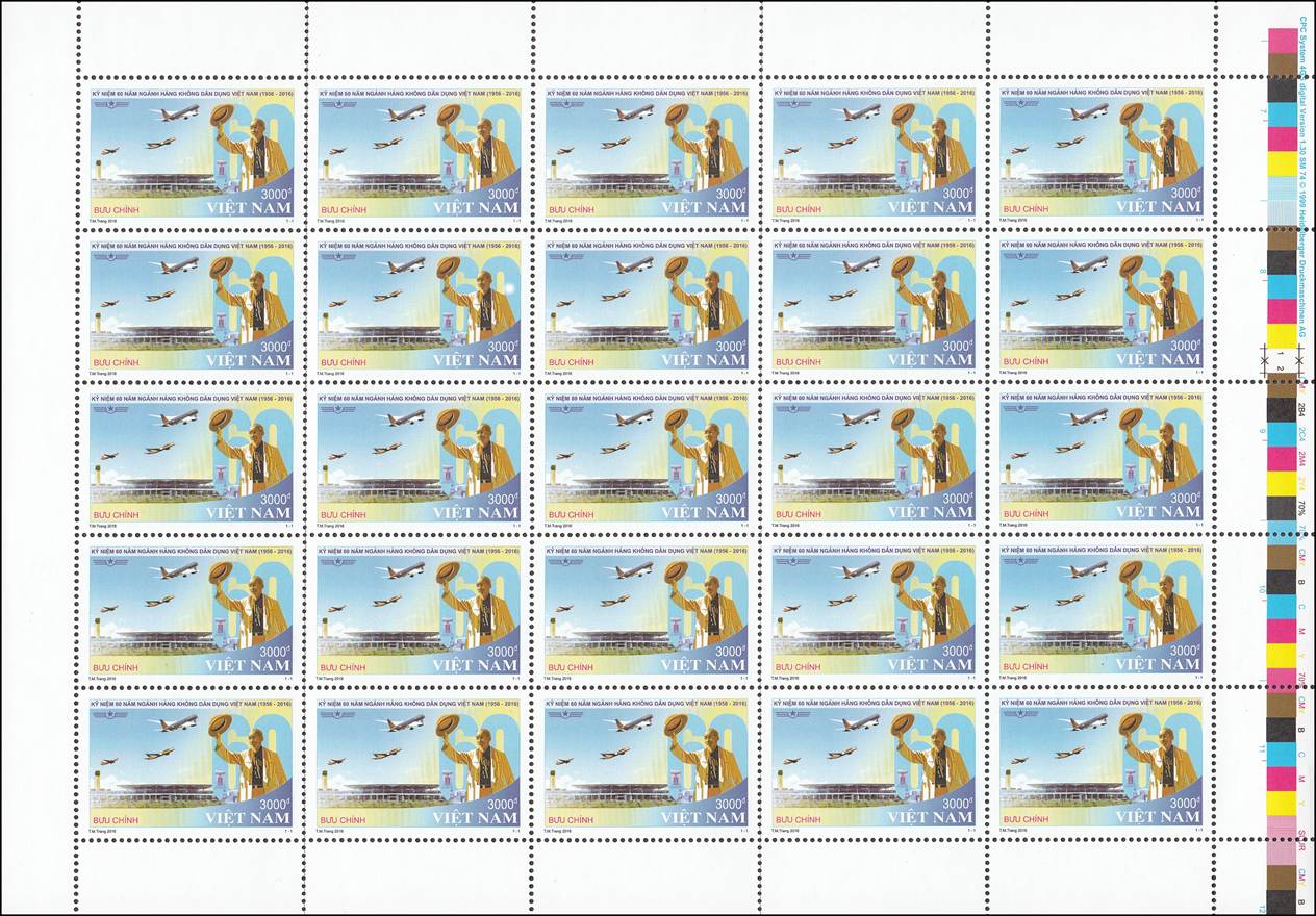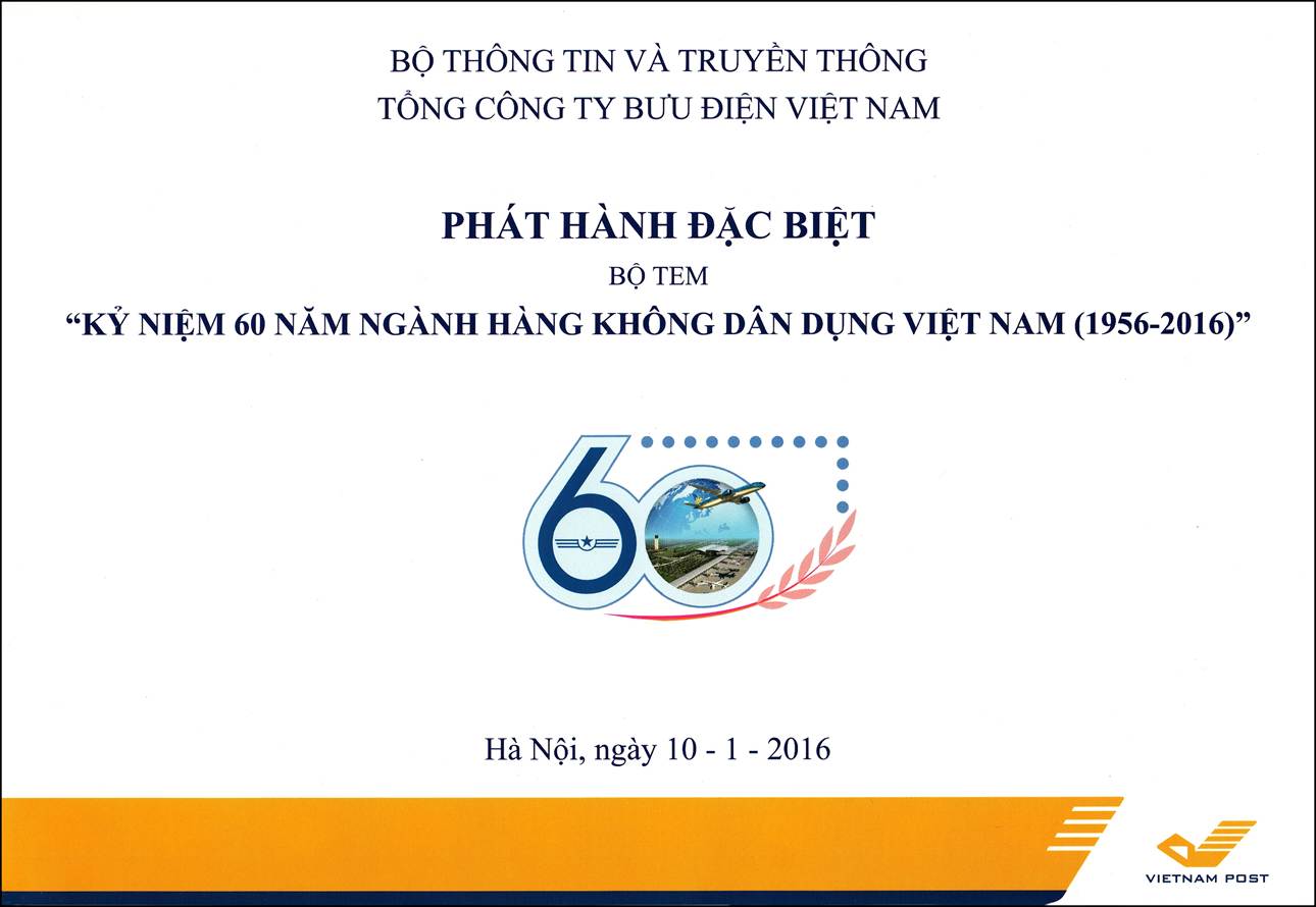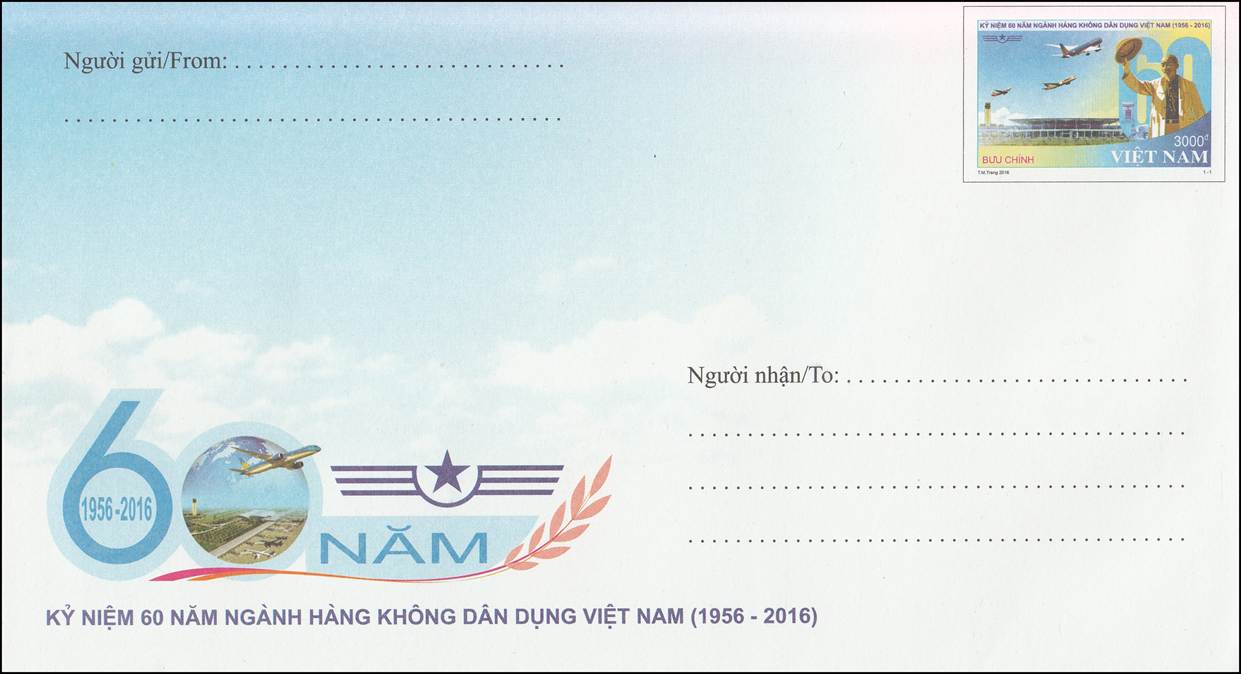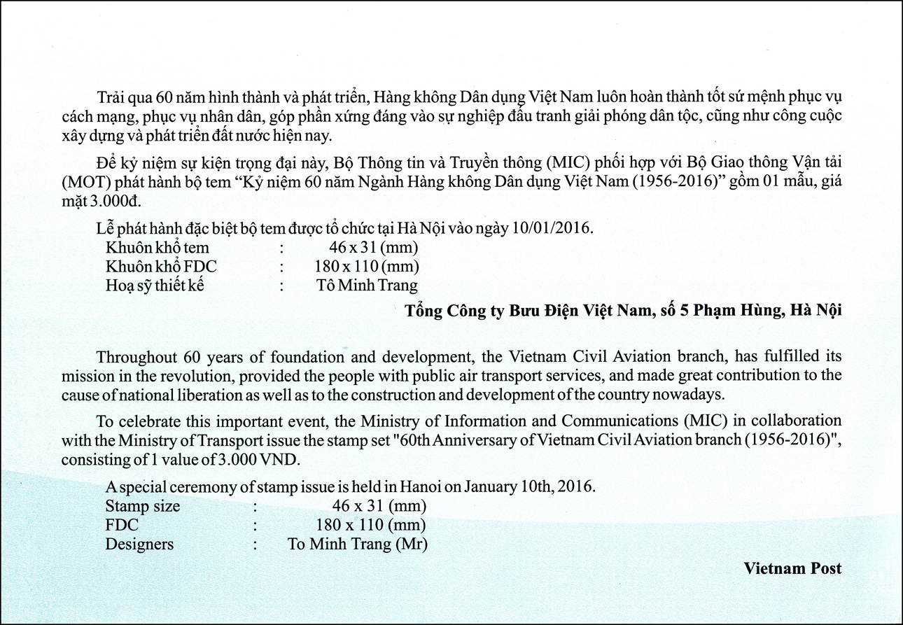 Background: The stamp was a collaborative project of the Ministry of Information and Communication and the Ministry of Transport. The stamp, designed by painter To Minh Trang, depicts the history of the civil aviation industry from 1956 to 2016, with its glorious achievements.
