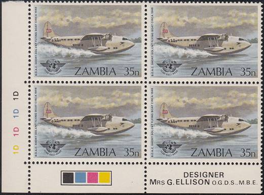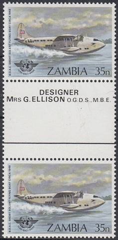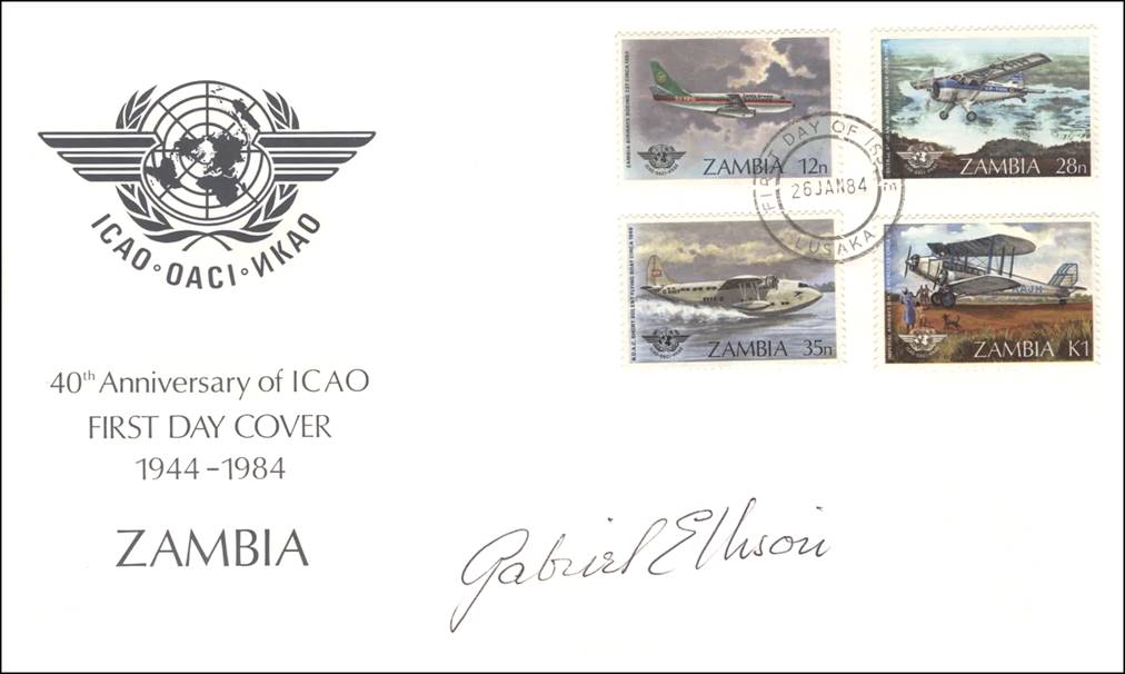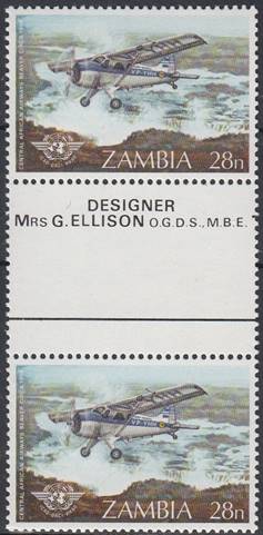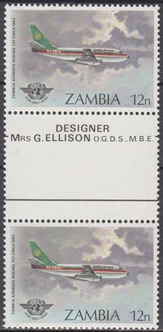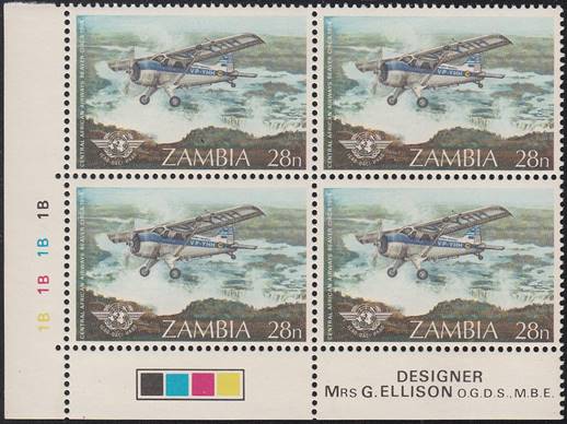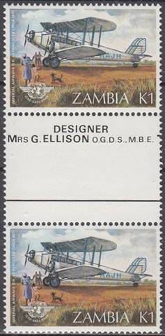 of Zambia, which was Gabriel Ellison (1930-2017) was a Zambian painter, sculptor, illustrator, stamp designer and writer. Gabriel Ellison was born Gabriel Ryan; she married Tony Ellison, a policeman in Lusaka. She is known for having designed Zambia's flag, the coat of arms and most of the stamps published in Zambia between the 1960s and 1990s when she was head of the Graphic Arts section at the Ministry of Information; she designed over 480 stamps for Zambia. Her murals have decorated many important buildings in Lusaka. |