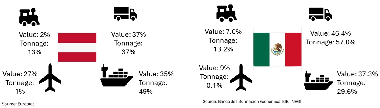 An illustrative example of the importance of air cargo in advanced, as well as developing economies. This time it was chosen Austria and Mexico. In 2023, air freight accounted for approximately 27 per cent of Austria's international trade by value, but only 1 per cent by tonnage. However, in Mexico, air freight accounted for approximately 9 per cent of international trade by value, but only 0.1 per cent of the total tonnage by weight.