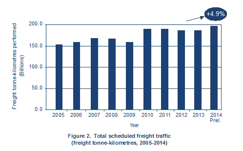 After nearly two years of negative or almost flat growth, scheduled total freight traffic rebounded in 2014, in line with improving economic prospects. Air freight, expressed in terms of scheduled total freight tonne-kilometres performed, posted an increase of 4.9 per cent. Approximately 50 million tonnes of freight were carried in 2014. Middle East carriers recorded overall double digit growth rates of 12.1 per cent. Africa grew at 6.0 per cent while Asia/Pacific increased by 5.5 per cent. North America, Europe and Latin America and the Caribbean grew at 3.2 per cent, 2.0 per cent and 1.2 per cent, respectively.