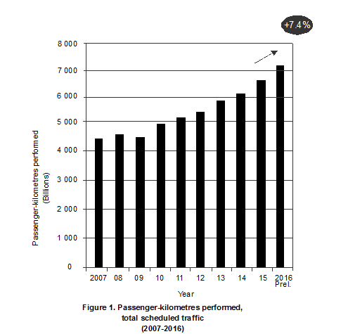 According to ICAO’s preliminary compilation of annual global statistics, the total number of passengers carried on scheduled services rose to 3.8 billion in 2016, which is 6.8 per cent higher than the previous year, while the number of departures reached 35.4 million in 2016, a 3.7 per cent increase compared to 2015. Detailed information can be viewed on the Presentation of 2016 Air Transport Statistical Results page.