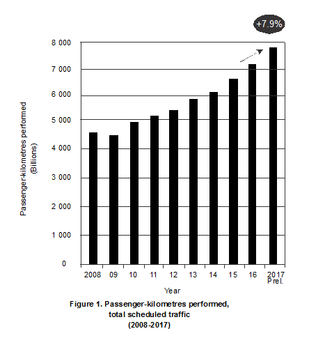According to ICAO’s preliminary compilation of annual global statistics, the total number of passengers carried on scheduled services rose to 4.1 billion in 2017, which is 7.2 per cent higher than the previous year, while the number of departures reached 36.7 million in 2017, a 3.1 per cent increase compared to 2016. Detailed air transport statistics appear on the Presentation of 2017 Air Transport Statistical Results page.