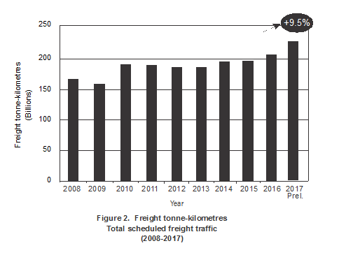 Approximately 56 million tonnes of freight were carried in 2017. Growth of scheduled total freight traffic, expressed in terms of scheduled total freight tonne-kilometres performed (FTKs), was at 9.5 per cent in 2017, significantly higher than the 3.6 per cent recorded in 2016. This growth was mainly due to the improving trade activity in 2017.