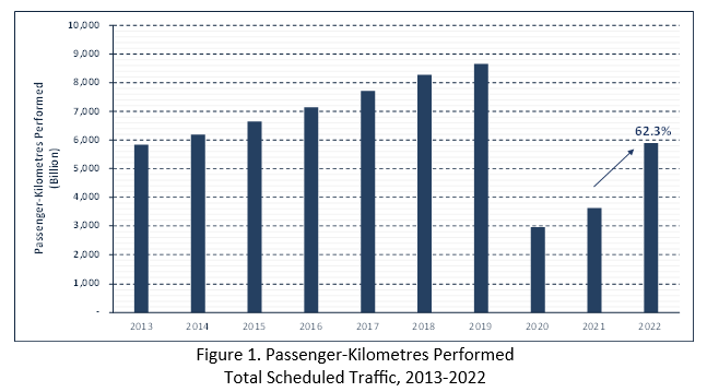 According to ICAO’s preliminary compilation of annual global statistics, the total number of passengers carried on scheduled services increased to 3.3 billion in 2022, which is 42.8 per cent higher than the previous year, while with the number of departures increasing to 29.8 million in 2022, a 23.1 per cent increase. Detailed air transport statistics appear on the Presentation of 2022 Air Transport Statistical Results page.