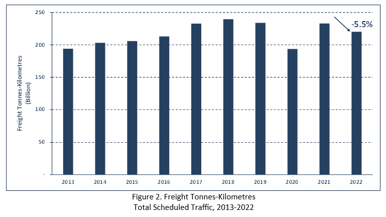 Scheduled international freight capacity in 2022, expressed in available freight tonne-kilometres, was approximately 359 billion, an increase of 13.1 per cent compared to 2021. The scheduled international freight load factor in 2022 decreased to 53.9 per cent.
