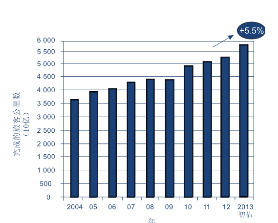 2013年,根据国际民航组织收集的运输业务量初步统计数字,所完成的世界定期航班客公里总数 — 即国际和国内运输量的总和比2012年增加了5.5%。载运的旅客数量上升达到31亿人次,比去年大约增加了4.5%;而2013年全球班机起降架次达到3 200万次,比2012年增加1.2%。详细的航空运输统计资料载于附录1。
