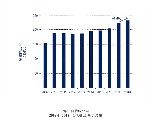 2018年国际定期航班货物运力,以可用货物吨公里表示,大约为3630亿,与2017年相比增长3.4%。国际定期航班货物载运比维持在55%不变。